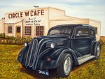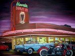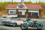 2007Olieverfschilderij Chevrolet Bel-Air Convertible 1957 en Harley- Davidson Duo-Glide 1959 Drive-in restaurant Route 66